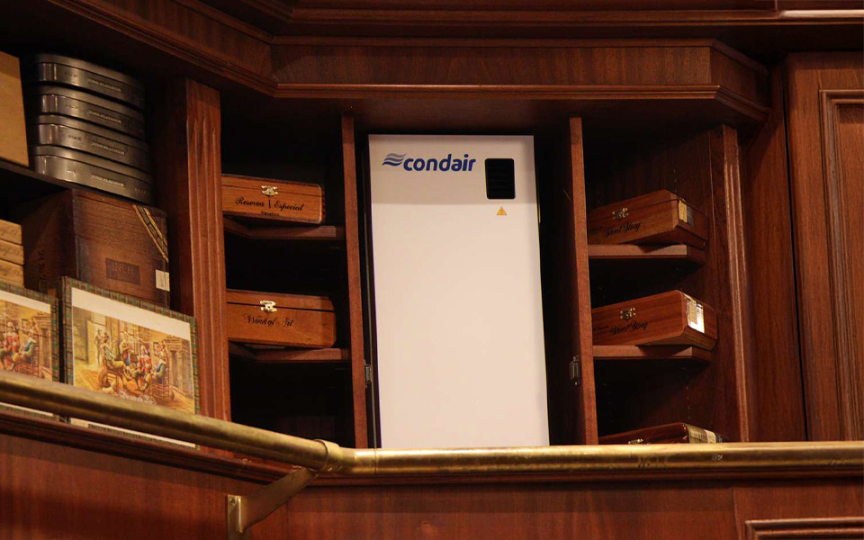 Lüdtke ist mit dem neuen Condair-Befeuchter sehr zufrieden. „Obwohl wir statt vier Geräten jetzt nur einen Befeuchter in Betrieb haben, verteilt sich die Feuchtigkeit dank unserer großen Deckenven-tilatoren sehr gut. Die Hygrometer im Raum zeigen nur ein oder zwei Prozent Abweichung.“ Somit lässt sich der zum Lagern von Zigarren ideale Bereich von 68 bis 72 Prozent relative Feuchte an allen Stellen des begehbaren Humidors einhalten.